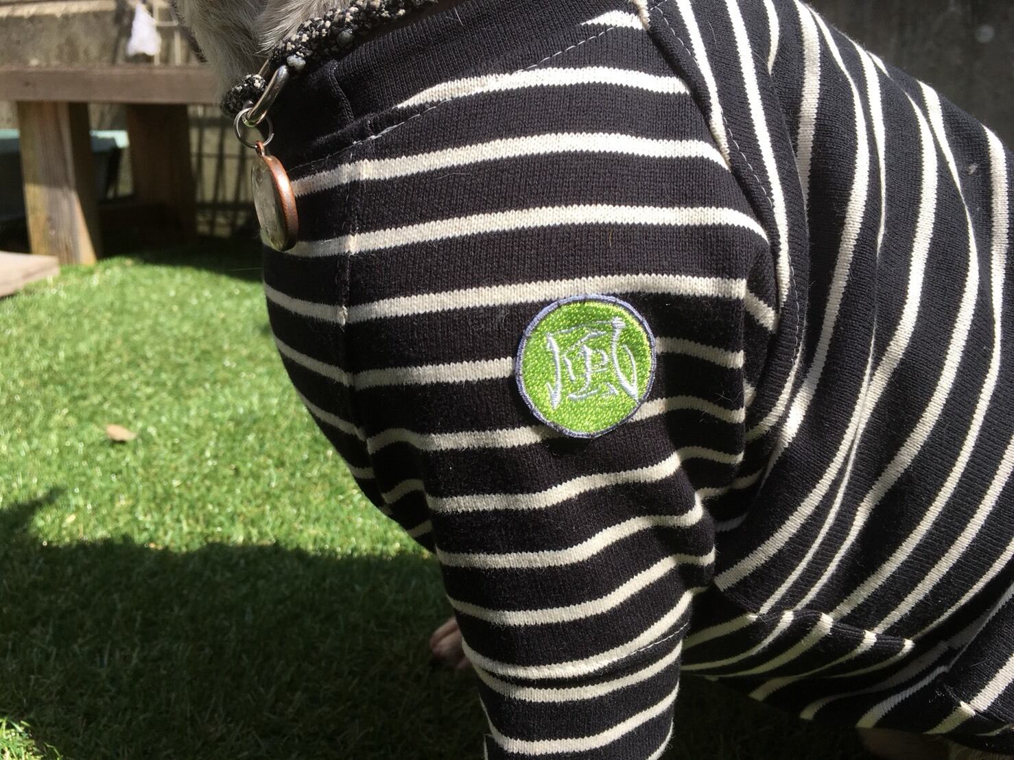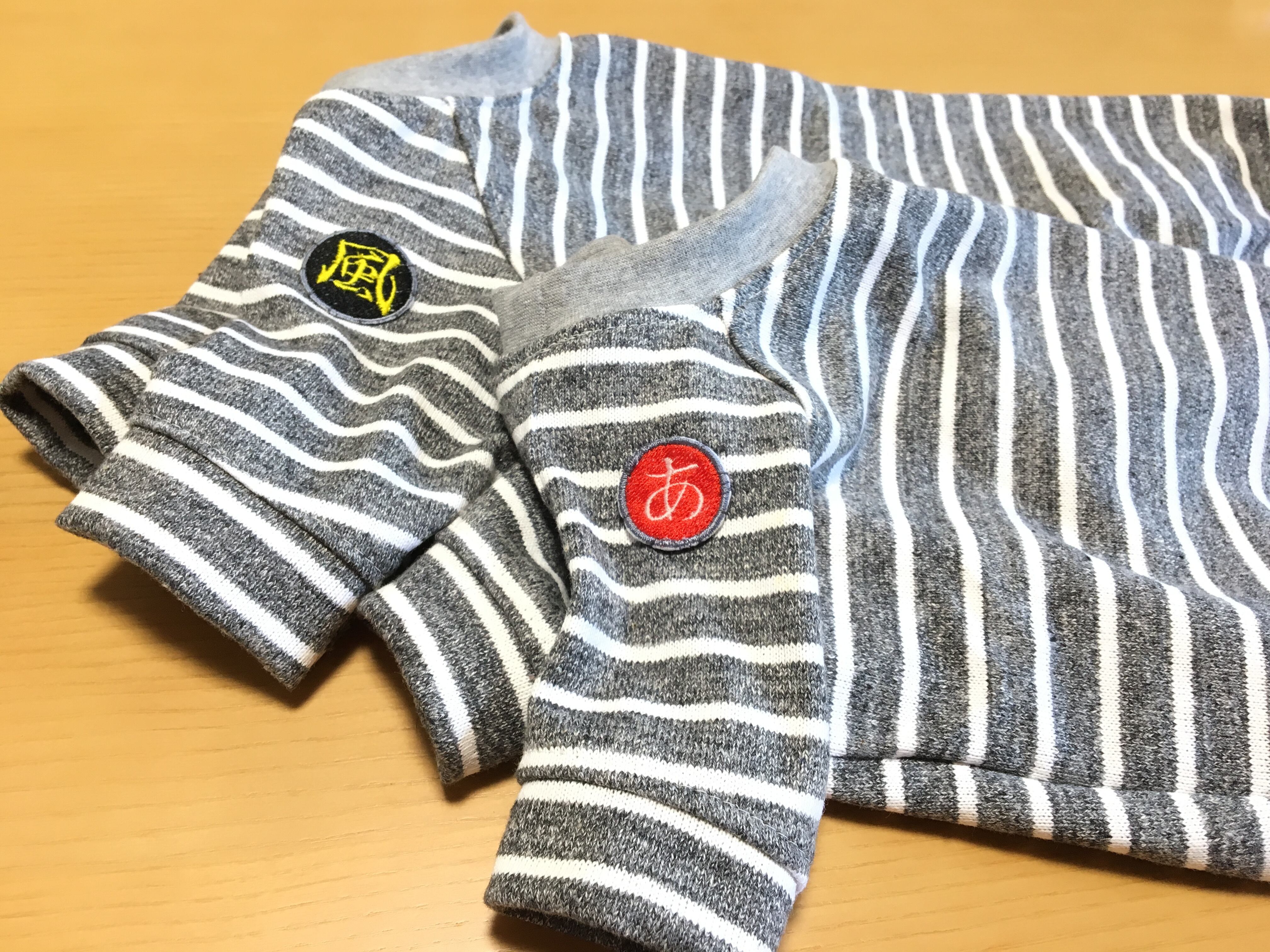 厚手のTシャツ程度の厚さのしっかりとした生地で、定番のボーダーにワンポイント刺繍ワッペンを施したボーダーシャツが出来ました(^^)