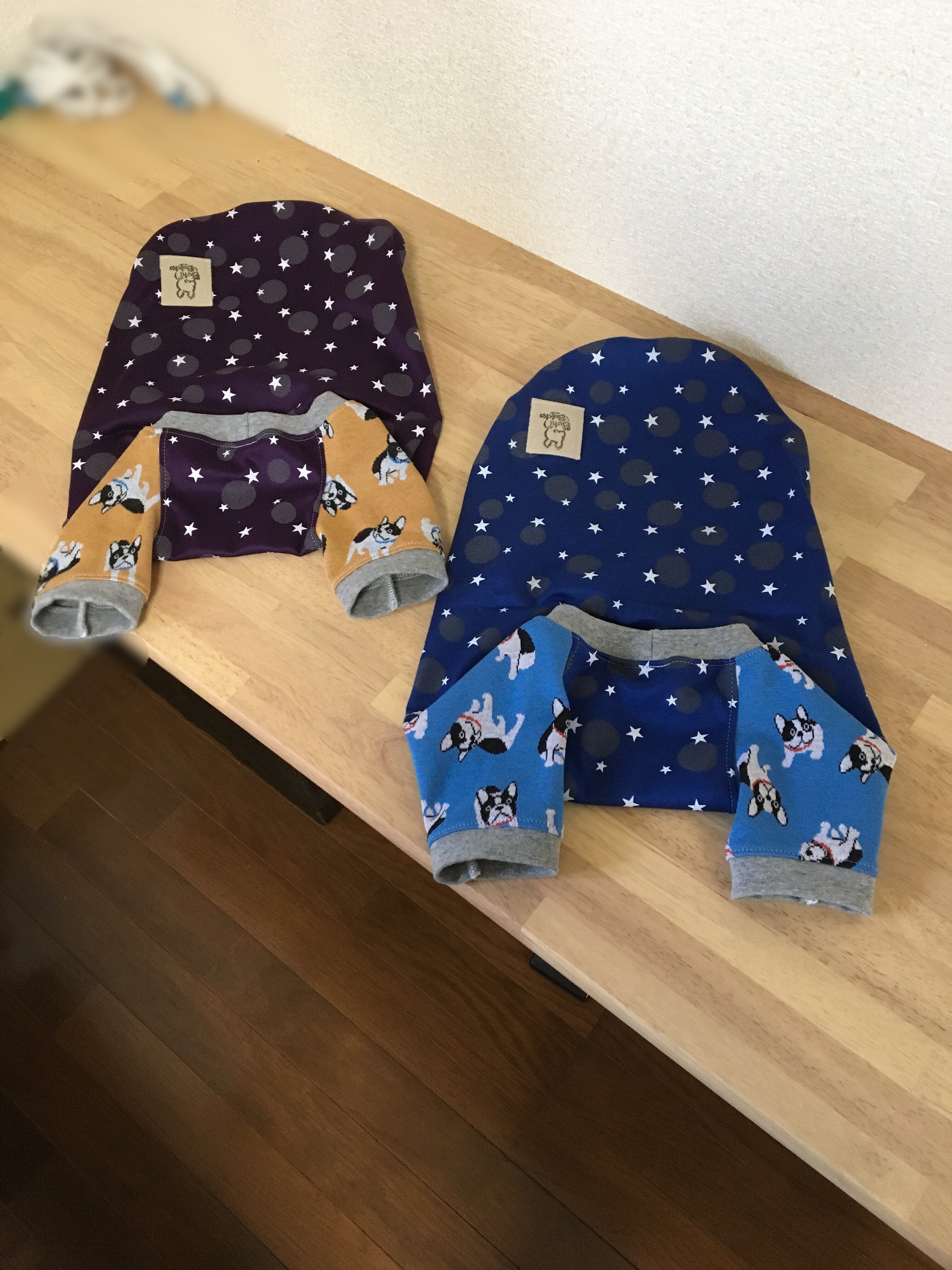 ドット×スターのフライス生地を身ごろに使い、袖の部分は可愛いフレンチブルドッグ柄のジャガードニットを使用した可愛いラグランシャツが出来ました。
